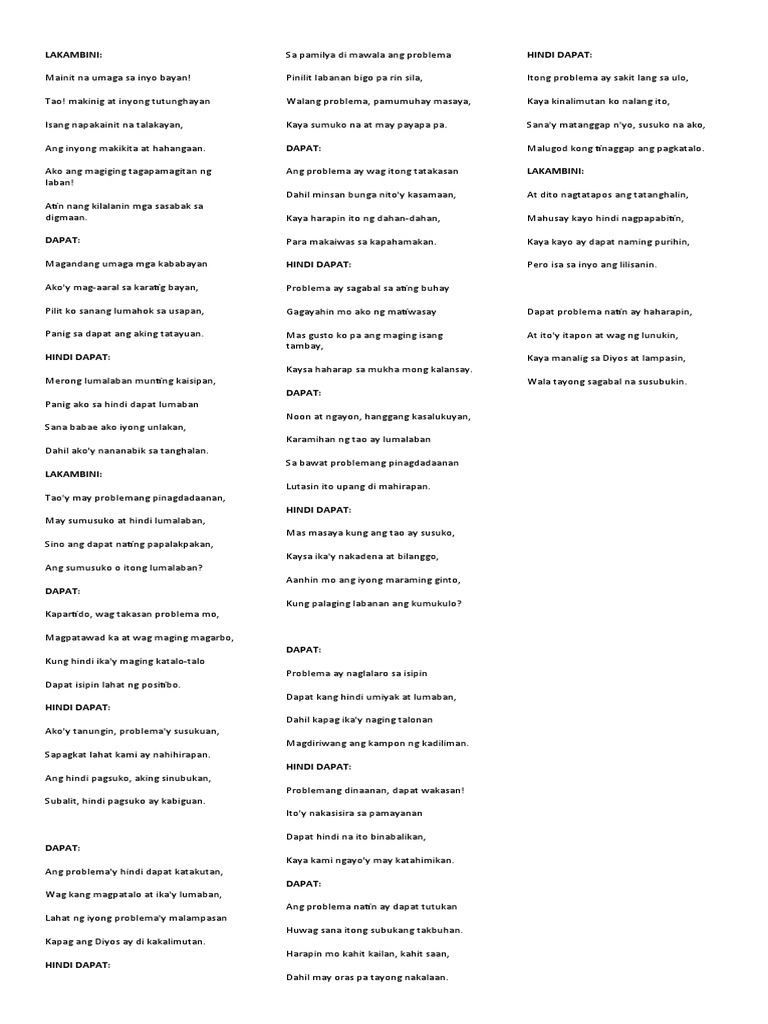 2122011 Balagtasan Dapat bang hatiin ang Camarines Sur Lakandiwa. Makinig at inyong tutunghayanIsang napakainit na talakayanAng inyong makikita at hahangaanDapatMagandang umaga mga kababayanAkoy mag-aaral sa karatig bayanPilit ko sanang lumahok sa usapanPanig sa dapat ang aking tatayuanHindi DapatMerong lumalaban munting kaisipanPanig ako sa hindi dapat. Ako lang ay nag-apura prusisyong kayhaba-haba.